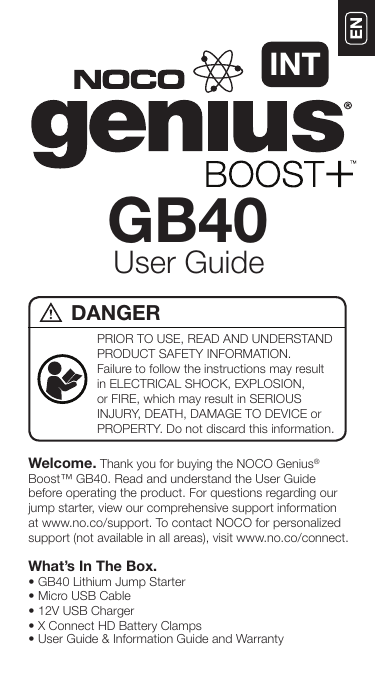 Thank you for buying the NOCO Genius Boost GB40. Read and understand the User Guide before operating the product. Über das GB40 Das NOCO Genius Boost GB40 ist ein ultra-kompaktes und tragbares Lithium-Ionen- Starthilfegerät für Pkw Boote Motorräder Geländefahrzeuge Rasenmäher Campingfahrzeuge Traktoren Lkw und mehr.